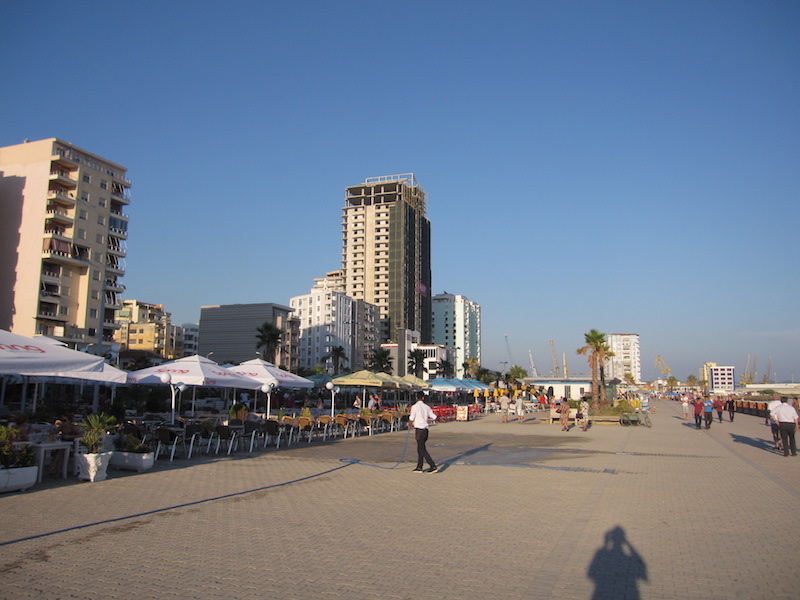 Nach einer Mittagspause brachen wir dann zu einer ersten Erkundung der Stadt Durrës auf. Sie ist im 7. vorchristlichen Jahrhundert von griechischen Kolonisatoren aus Korinth und Korfu gegründet und im Jahr 229 v. Chr. von den Römern erobert worden, die sie fortan Dyrrhachium nannten. Nach bewegten Jahrhunderten kam die Stadt Anfang des 13. Jahrhunderts in den Besitz der Republik Venedig. Auf den großen Stadtturm und die Reste der Stadtmauer aus dieser Zeit trafen wir schon bald auf unserer Erkundungstour. Dann ließen wir uns auf dem Boulevard Epidamni an den frisch renovierten Geschäftshäusern aus den 1920er und 1930er Jahren vorbei hoch und `runter treiben. Anschließend ging’s auf den westlich des Hafengeländes großzügig angelegten, wenn auch nicht unbedingt schönen Strandboulevard. Auf diesem fanden sich – der Abend rückte näher – immer mehr Menschen ein, vor allem Auslandsalbaner, wie von Tim angekündigt.