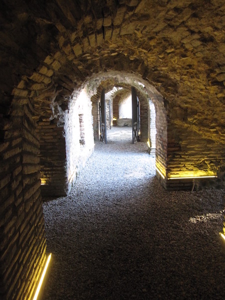 Auf der Rückfahrt nach Durrës verpassten wir wiederum mangels Beschilderung die Auffahrt auf die Autobahn, haben aber mittels Nachfrage an einer Tankstelle – dieses Mal auf Englisch – den Weg bald gefunden. Nach einer Siesta und einem Cappuccino machten wir uns dann zum archäologischen Highlight von Durrës auf, dem römischen Amphitheater. 1966 wurde es nur durch Zufall entdeckt, als ein Bewohner der Stadt seinen Garten umgraben wollte. Zur Zeit Kaiser Hadrians im Anfang des 2. Jahrhunderts nach Christus errichtet, konnte es auf Grund der heutigen Bebauung nicht ganz freigelegt werden. Aber im unterirdischen Bereich lassen sich sowohl der Ausgang für die Gladiatoren als auch die Verließe für die Gefangenen und die wilden Tiere noch gut ausmachen.