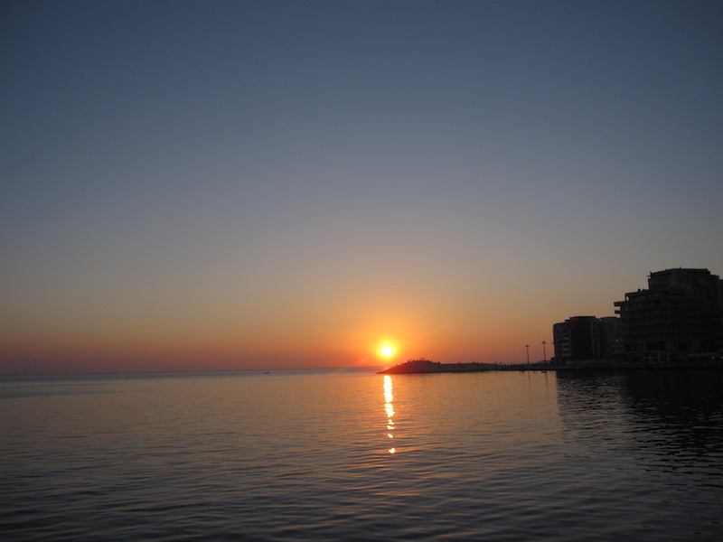 Da sich nach der Besichtigung des Amphitheaters unsere Lust auf einen Besuch im archäologischen Museum der Stadt in Grenzen hielt, gingen wir zum Boulevard Epidamni um Eis zu essen und ein wenig zu shoppen. Und dann spazierten wir noch einmal in großer Menschenmenge auf der Promenade. Schließlich wendeten wir unsere Schritte über eine Brücke mit Ladenpassage zu einem Restaurant, auf dessen Terrasse wir, den Sonnenuntergang beobachtend und von einer leichten Brise umgeben, unser Abendessen einnahmen, welches wiederum sehr schmackhaft war, wenn auch deutlich teurer als am Vorabend. Die Location muss auch in Albanien mitbezahlt werden.