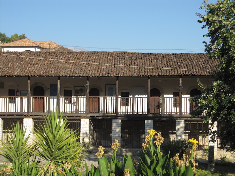 Dann ging`s weiter zum mittelalterlichen osmanischen Stadtzentrum mit der Königsmoschee, die nach Ausrufung Albaniens zum ersten atheistischen Staat der Welt durch Enver Hoxha (1967) als Tennishalle genutzt worden war. Gleich daneben befindet sich ein ehemaliges Kloster der Bektashi-Derwische, einer schiitischen Gemeinschaft, mit einem lang gestreckten Gästehaus. Als wir uns von dort bergan ins Gassengewirr wagten, trafen wir auf einen Mann mittleren Alters. Der wollte uns einerseits selbst gemachte Marmeladen verkaufen, andererseits zu einem Abendessen im Garten seines Hauses überreden, dessen Bestandteile uns ein junges Mädchen, das gut Englisch sprach, erläuterte.