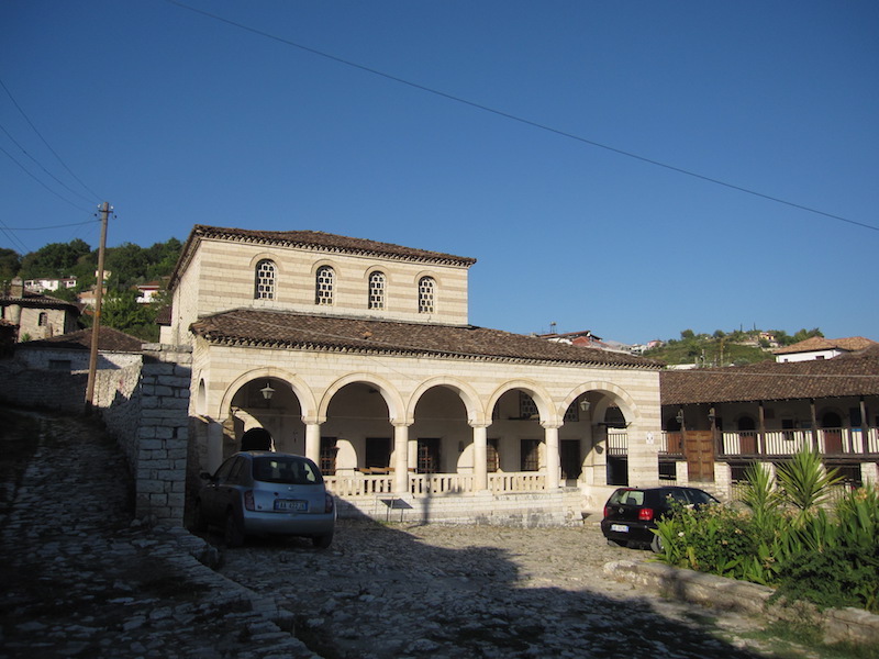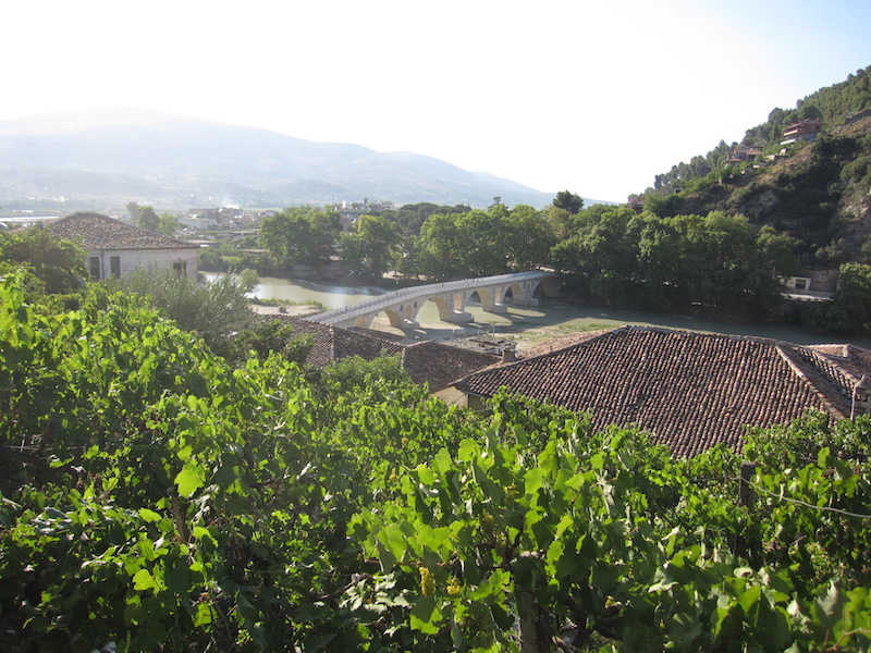 Der nette Portier unseres im Zentrum der Stadt gelegenen Hotels lässt uns unsere Zimmer selbst aussuchen – wir seien die ersten Ankömmlinge – und lädt uns freundlich zu einem Getränk auf die Dachterrasse ein, bis die Zimmer gerichtet seien. Von da aus bot sich uns ein herrlicher Blick auf das Osum-Tal und die weißen Bürgerhäuser mit den Ziegeldächern zu beiden Seiten des Flusses. Wir verstanden, warum serbische Eroberer im Hochmittelalter der Stadt den Namen Beograd („Weiße Stadt“) gegeben hatten, woraus im Albanischen dann Berat geworden ist.