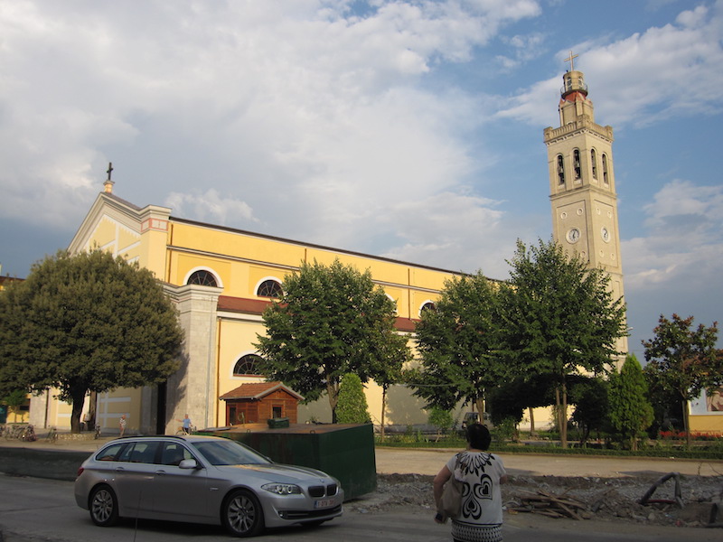 Den folgenden Sonntag gingen wir ruhig an. Nach dem Frühstück standen wieder Schwimmen im Meer und Lesen im Kadare-Roman am Strand auf dem Programm. Nach dem Mittagessen und einer Siesta trafen wir uns gegen 16 Uhr in der Hotellobby. Da galt es mit dem Personal erst einmal dafür zu sorgen, dass unser zugeparktes Mietauto von der Blockade befreit wurde. Dann ging’s nach Vlorë, wo wir uns im Café Pascucci (Gelateria Arjoli) am Boulevard Ismail Qemali niederließen und Cappuccino und Crème-brulé-Torte genossen – beides überaus köstlich. Danach ging’s zu Fuß zur kath. Kirche „Hl. Maria und Hl. Ludwig“, in der wir mit hauptsächlich jugendlichen Teilnehmer(inne)n und dem Apostolischen Administrator Hil Kabashi die Hl. Messe feierten.