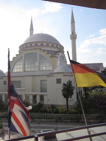 Nach einer Siesta im Hotel und einem Cappucino in einem Café ganz in der Fußgängerzone erkundeten wir auf unserem Nachmittagsspaziergang zwei Stadtviertel Shkodërs: Gjuhadol und Serrec. In ersterem lag unser Hotel gegenüber der Ebu-Bekir-Moschee an der restaurierten Prachtstraße Kolë Idromeno.